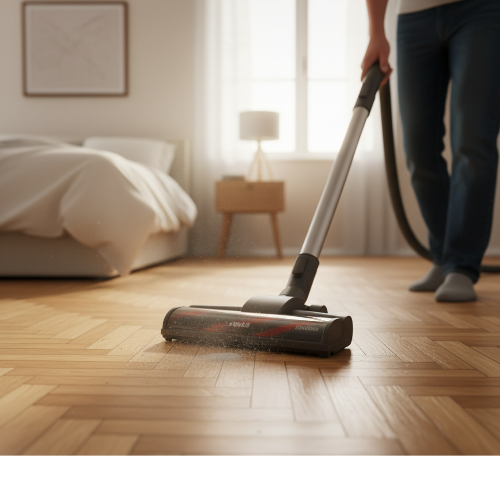 Halte deinen Boden durch regelmäßiges Absaugen von Staub und Schmutz frei. Verwende immer die weiche Borsteneinstellung deines Staubsaugers, damit der Saugkopf deinen Boden nicht zerkratzt.